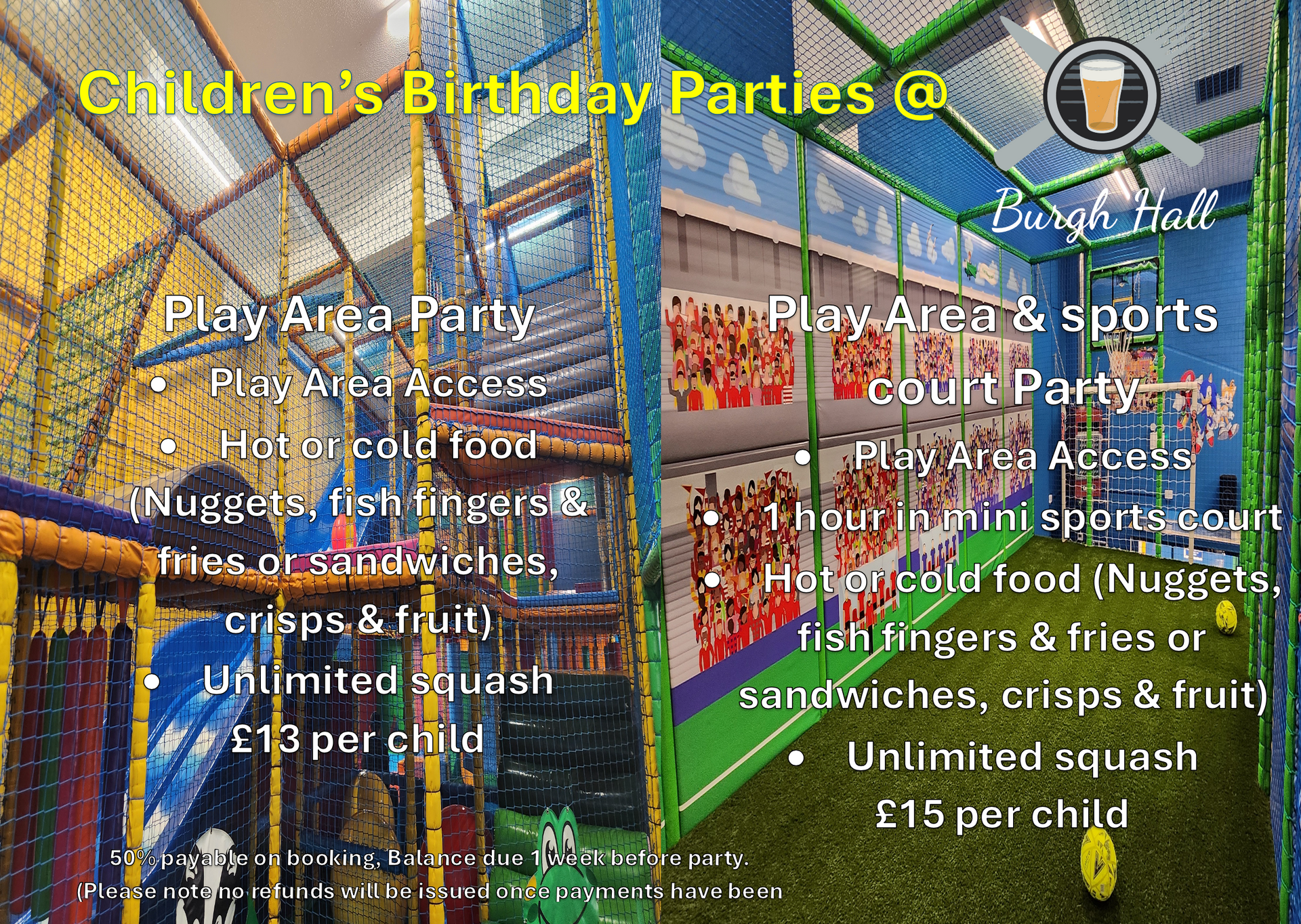 £15 per child for play area, hot or cold food (nuggets, fish fingers & fries or sandwiches, fruit & crisps), unlimited squash & 1 hour in the mini sports court.